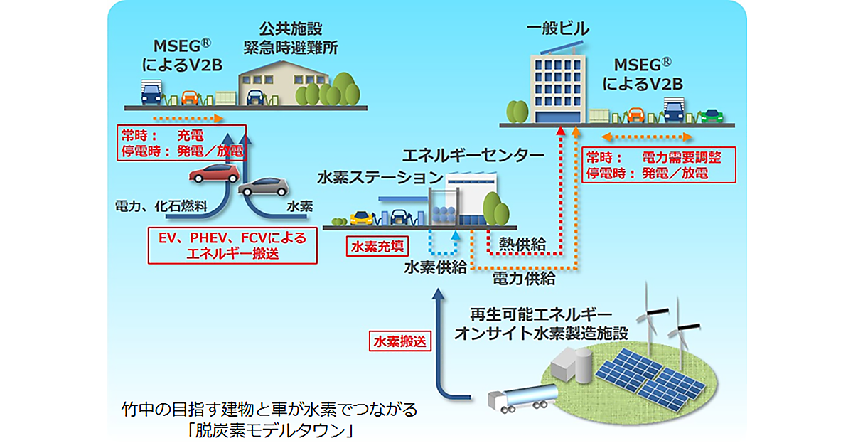 竹中工務店は再生可能エネルギーを最大限活用する街区「竹中脱炭素モデルタウン」構想を掲げている。ビルなどの設置した太陽光発電設備や定置型蓄電池、太陽光や風力で発電した電力で運転する水素製造施設などと、EV、FCVなどの電動車を活用して、再生可能エネルギーを発電設備を設置した建物だけでなく、ほかの建物でも再生可能エネルギーを活用する街を作る構想だ。今回の実証もこの構想の実現に向けたものと言える。