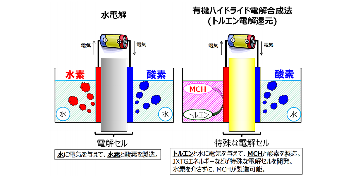 有機ハイドライド電解合成法では、特殊な電解セルでトルエンと水に電気をかけることで、MCHと酸素を得る。電解セルはJXTGエネルギーなどが開発した。貯蔵、運搬前に一旦水素を生成する必要がなくなるため、関連する機器を減らし、水素の生成から貯蔵、運搬、販売までの流れでかかるコストを大きく圧縮できる可能性がある。