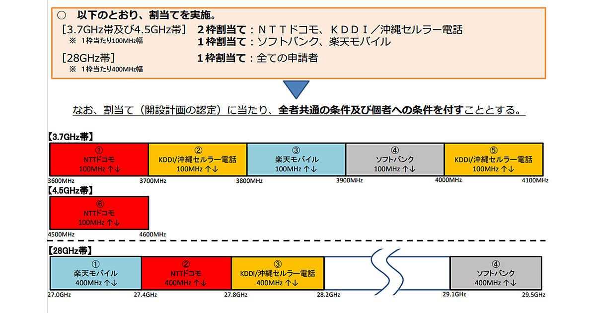 総務省は2019年4月10日、5G無線通信サービスに使用する電波の周波数帯割り当て結果を発表した。2019年1月24日から2月25日までに申請を受け付けたところ、NTTドコモ、KDDI/沖縄セルラー、ソフトバンク、楽天モバイルが申請を出した。今回割り当てる周波数は合計で10枠。NTTドコモ、KDDI/沖縄セルラー、ソフトバンクの3社は3枠、楽天モバイルは2枠を希望し、10枠に対して11枠の希望が寄せられた。審査の結果、ソフトバンクは希望より1枠少ない2枠を、ほかの3社は希望通り割り当てることになった。
